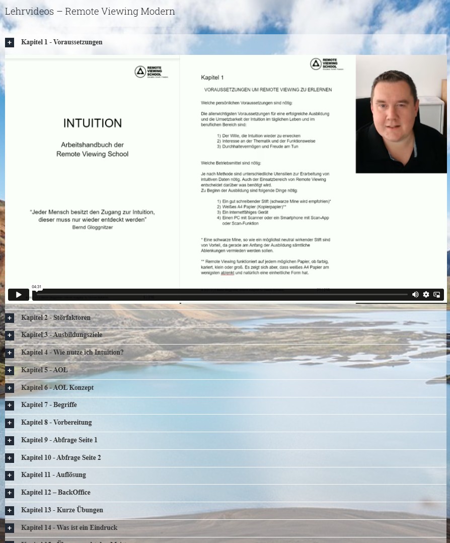 Mit den Lehrvideos für Remote Viewing bzw. Fernwahrnehmung erhalten Sie einen kompletten und detaillierten Überblick für alle Methoden (Remote Viewing Modern und Classic).
